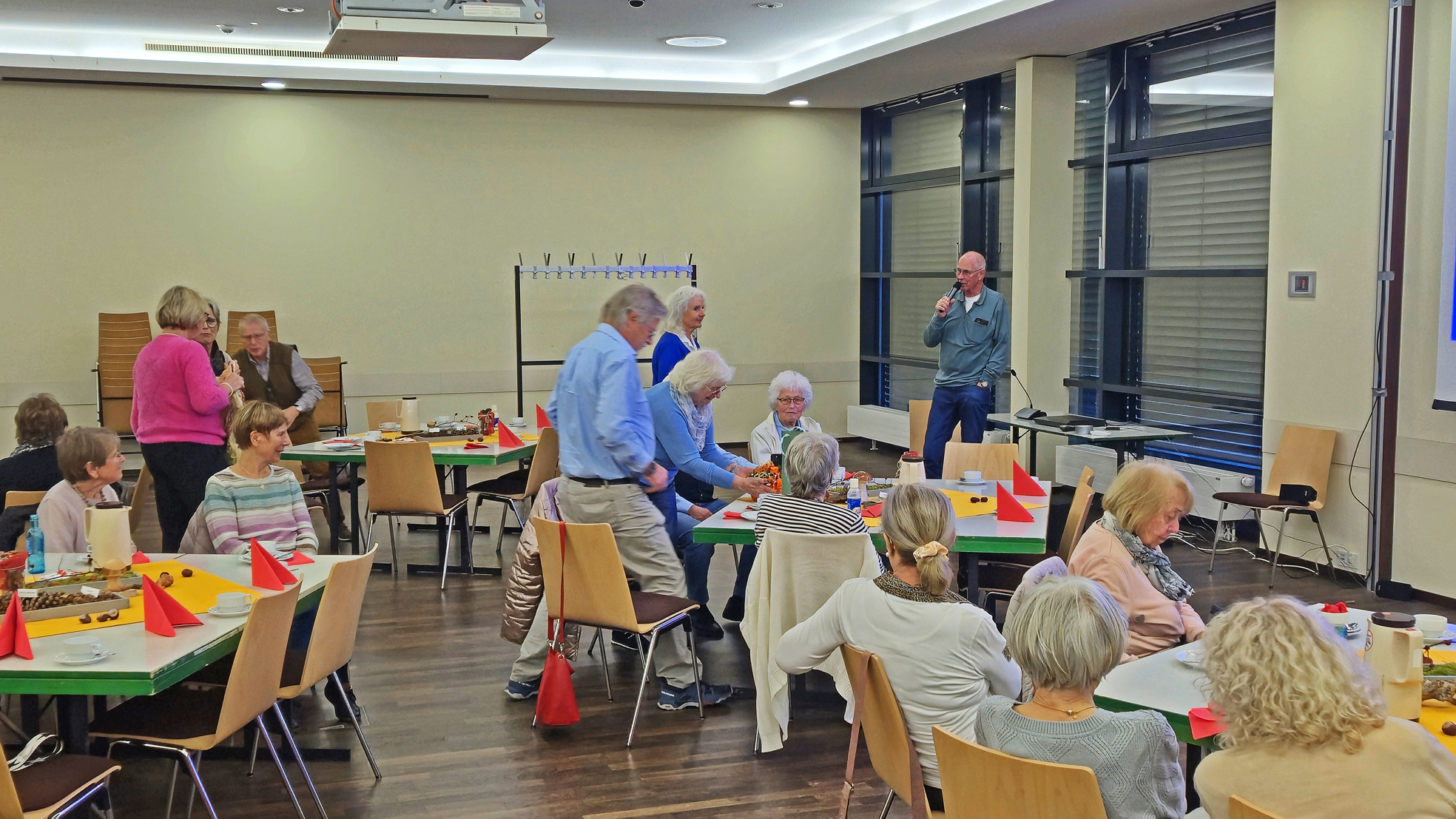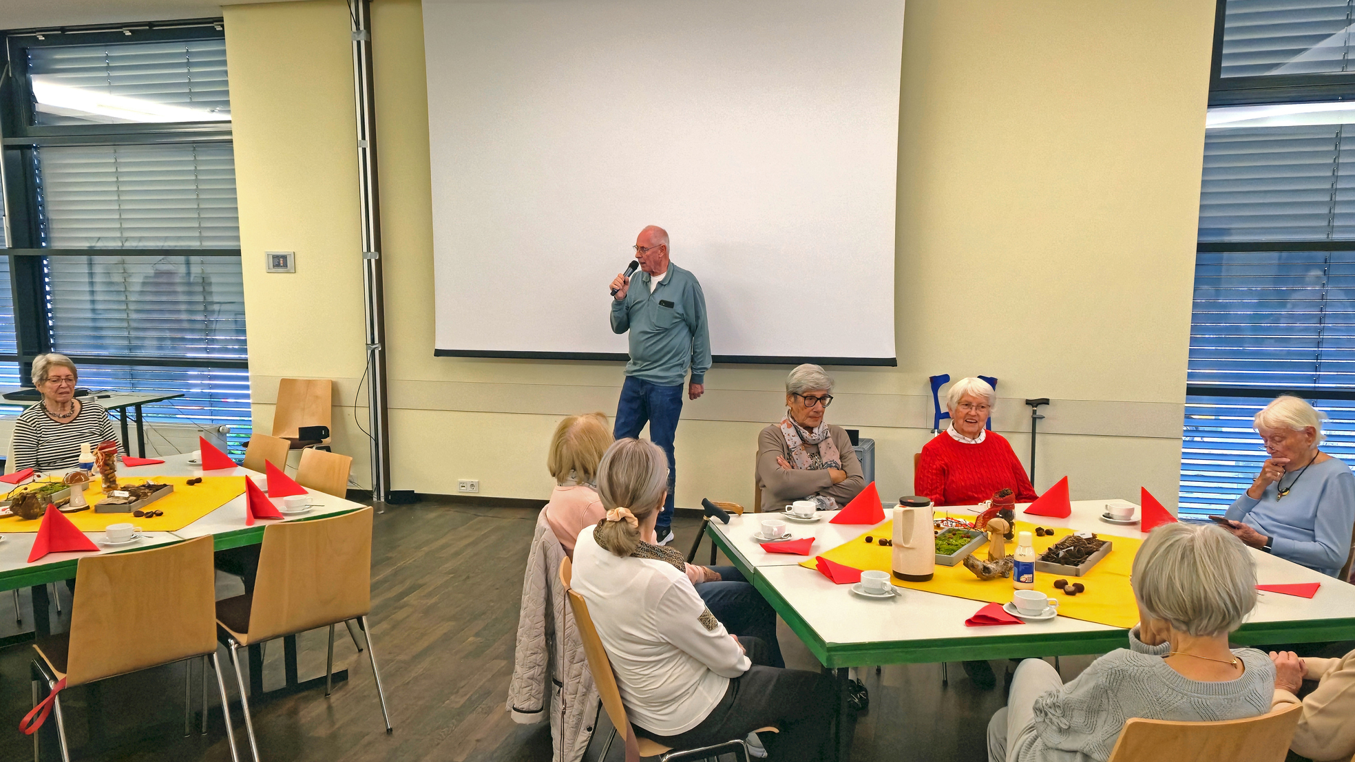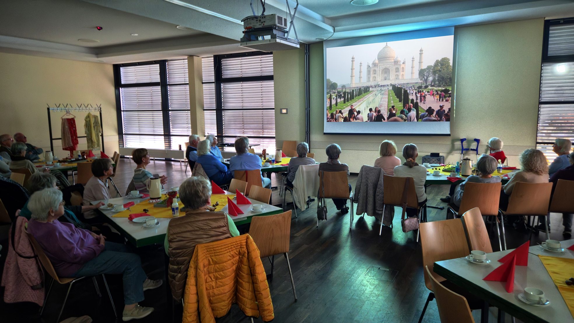 Bei Kaffee und Kuchen, an liebevoll und herbstlich dekorierten Tischen, nutzten die Teilnehmenden die angenehme Atmosphäre, um miteinander ins Gespräch zu kommen. Im Mittelpunkt stand der bildreiche Reisebericht von Herrn Lotz und seiner Frau, die vor einigen Jahren den nordwestlichen Teil Indiens bereisten. Ihr sorgfältig zusammengestellter und eindrucksvoll präsentierter Film nahm das Publikum mit auf eine faszinierende Reise durch eine Region, die vielen noch unbekannt ist.